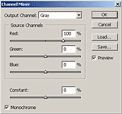 Pour maintenir une luminosité constante, il faut que la somme des canaux soit égale à 100%. L'option "Constant" peut être ajustée pour augmenter ou diminuer la luminosité totale. Si le but est de mimer la perception humaine, il faut à peu près le dosage suivant: rouge=30%, vert=59% and bleu=11%.