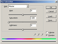 La désaturation des couleurs est la méthode la plus simple de conversion, mais elle s'avère aussi être celle qui donnent les moins bons résultats pour la bonne et simple raison que les canaux RVB sont modifiés en bloc. Cependant, cela reste une des méthodes les plus utilisées par le grand public. Avec Photoshop, on y accède sous Image > Ajustements > Désaturation.