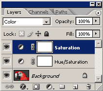 Sur la couche supérieure, dédiée à la saturation, il faut régler le mode de masquage sur "couleur" et mettre la saturation au minimum, c'est-à-dire "-100," (voir ci-dessous). |